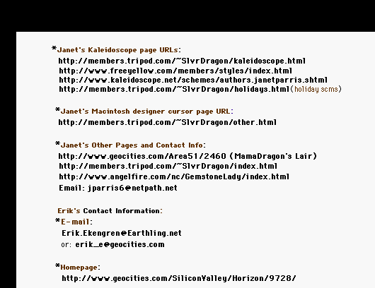 Downloadable sample schemes may be found at: http://www.kaleidoscope.net/schemes/authors/janetparris.shtml