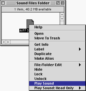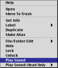 Announcing: PlaySound CMM * a contextual menu to play AIFF sound files directly from the Finder-- no sound app needed * requires MacOS 8 and PPC * shareware-- $5 for personal use, site license also available -------------------------------------------------------------------- PlaySound CMM can make life slightly easier for sound designers, musicians, multimedia asset managers, programmers, music editors, archivists, sound librarians-- anyone who has to manage collections of AIFF sound files on MacOS computers. (Support for WAV and Sound Designer II file formats coming in version 1.1).