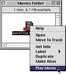 PlayMovie CMM, a recent shareware "Cool Tool of the Week" at the Webintosh site, is a Mac OS Contextual Menu plug-in that uses QuickTime to let you play movies directly from the Finder, without having to open any application (and then goes away all by itself). Just control-click on the file, select 'Play Movie' from the Contextual Menu, and watch.
