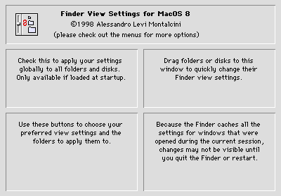 Finder View Settings makes it much easier to manage the new MacOS 8 folder-specific view settings. It can globally override all of your folder-specific view settings, making MacOS 8 behave more like System 7, or easily change the requested view settings for single folders or entire disks.