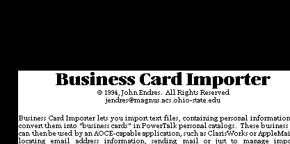 Business Card Importer is an application that allows a PowerTalk personal catalog to be populated with business cards from data in a text file. It will create addresses in the business cards that are compatible with most personal or server gateways, especially those from StarNine.