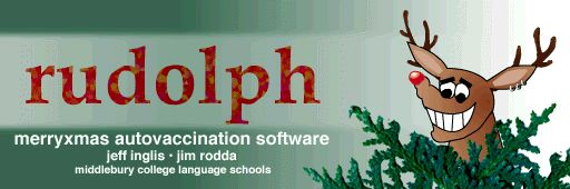 Rudolph is an automated merryxmas and merry2xmas virus fighter. It can detect and disinfect stacks infected with the merryxmas virus. Further, it inoculates stacks against ever being infected. Rudolph is a major improvement over other anti-merryxmas stacks in the following ways: 1) automated execution and quitting (runs unattended in "Startup Items" or "Shutdown Items") 2) inoculation of stacks - prevent infection before it happens! 3) an option for single-file checking, disinfection, and inoculation (and not just an entire volume) Rudolph was created by Jeff Inglis and Jim Rodda, of the Middlebury College Language Schools. The merryxmas and merry2xmas viruses are HyperCard-only viruses.
