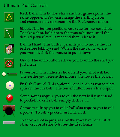 Ultimate Pool is a physically realistic pool simulation game for the Mac. The balls, pool table, and cues are all scaled versions of their real-world counterparts, and the balls roll and collide just as they would on a real pool table. Ultimate Pool comes with 7 computer opponents of widely varying abilities, and these games: Stripes & Solids, 8-ball, 9-ball, 14.1 Continuous, Cutthroat Rotation, and 41. Ultimate Pool requires: A Power PC Macintosh, System 7.0 or greater; 256 colors or greys; a 640 x 480 display; Sound Manager 3.0; 8 Meg of RAM; and 4 Meg of hard disk. Ultimate Pool is $20 shareware.