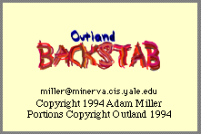 Backstab is a game application for Outland. You must download the Outland Gateway and connect to Outland to use this program. It is not a standalone application. Backstab was developed by Adam Miller.